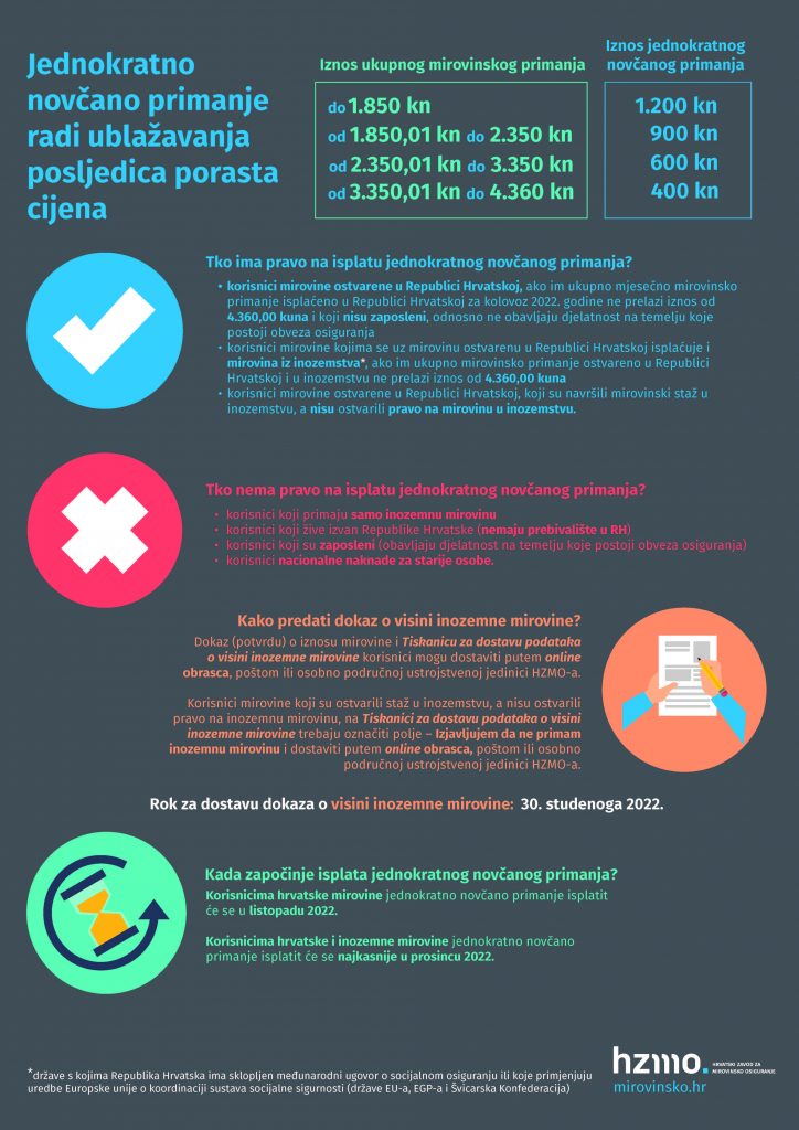 - korisnicima mirovine ostvarene u Republici Hrvatskoj koji su navršili mirovinski staž u inozemstvu, a nisu ostvarili pravo na mirovinu u inozemstvu, ako im ukupno mjesečno mirovinsko primanje isplaćeno u Republici Hrvatskoj za kolovoz 2022. godine ne prelazi iznos od 4.360,00 kuna.