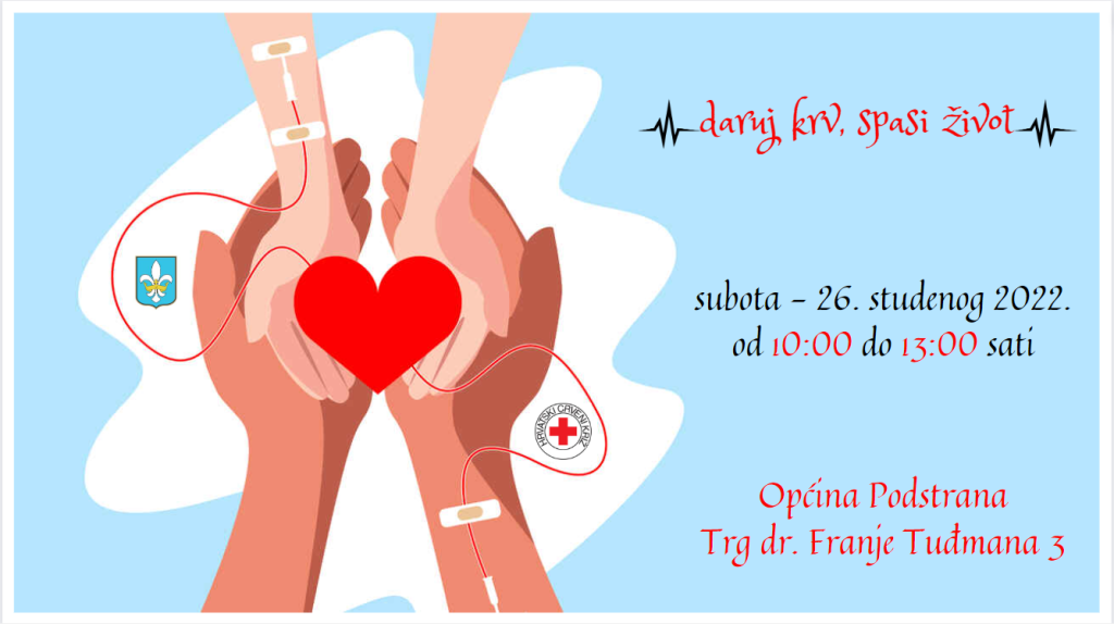 Akcija dobrovoljnog darivanja krvi održati će se u subotu 26. studenog 2022. godine, od 10:00 do 13:00 sati u prostorijama Općine Podstrana, na adresi Trg dr. Franje Tuđmana 3.