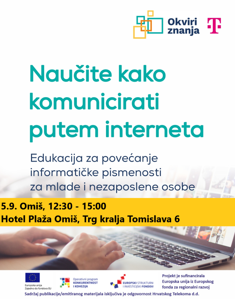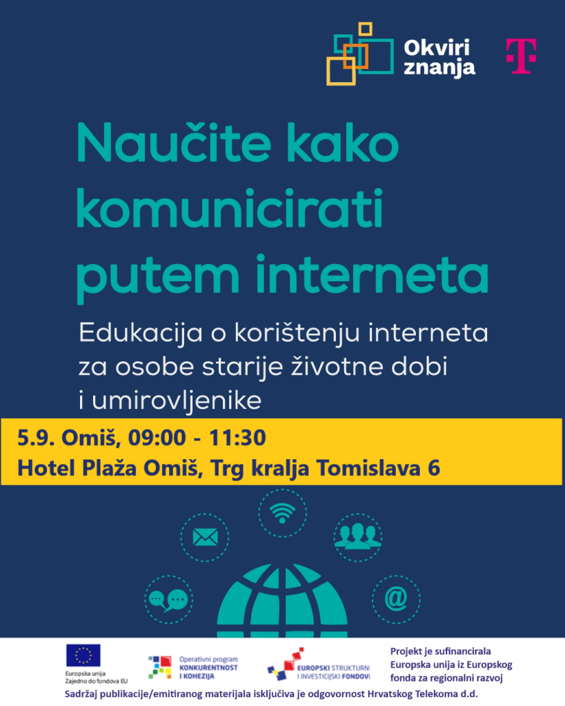 U okviru provedbe projekta „Razvoj infrastrukture širokopojasnog pristupa u Gradu Omišu te općinama Dugi Rat, Podstrana i Zadvarje“, ref.br. KK.02.1.1.01.0012, Hrvatski Telekom d.d. u suradnji s Gradom Omišem, organizira besplatne edukacije na temu korištenja interneta za osobe starije životne dobi i umirovljenike i na temu povećanja informatičke pismenosti za mlade i nezaposlene osobe radi stjecanja informatičkih vještina i znanja u svrhu povećanja zapošljivosti.