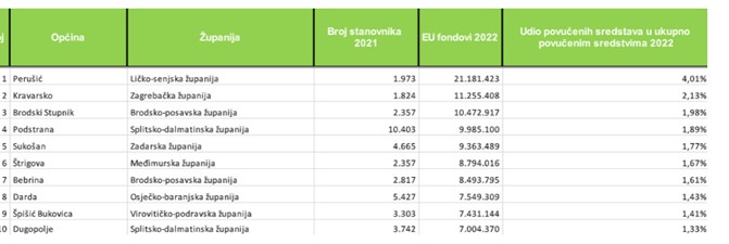 Na popisu se, na visokom četvrtom mjestu po udjelu u ukupno povučenim sredstvima, našla Općina Podstrana koja je, tijekom 2022. godine, povukla 9.985.100 kuna, odnosno oko 1.325.250 € iz EU fondova. Ukupno su općine, kojih u Republici Hrvatskoj ima 428, lani povukle 528 milijuna kuna (70,1 milijun eura).