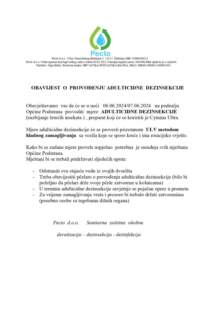 Obavještavamo Vas da će se u noći 06.06.2024/07.06.2024 godine započeti sa provođenjem obvezatne adulticidne dezinsekcije ( suzbijanje letećih insekata) na području Općine Podstrana.