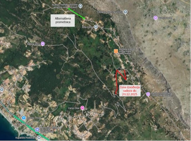 Molimo mještane koji žive u zoni iznad točke izvođenja radova, da kao alternativnu prometnicu za servisiranje objekata i nužnu opskrbu koriste makadamsku prometnicu koja počinje u Strožancu na kraju ulice Put Starog Sela, odnosno Put sv. Fabjana.