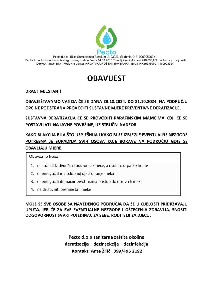 Obavještavamo Vas da de se dana 28.10.2024. započeti sa provođenjem obvezatne preventivne jesenske deratizacije na području Opdine Podstrana, ista de trajati do 31.10.2024.