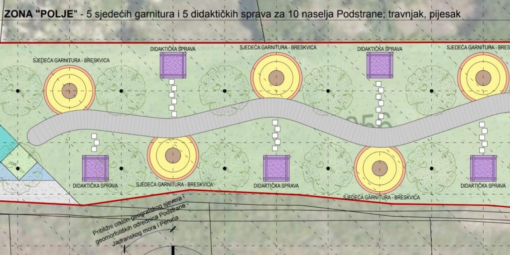 ZONA “POLJE” – pješačka staza, sjedeće garniture za odmor, travnjak, stabla i rasvjeta