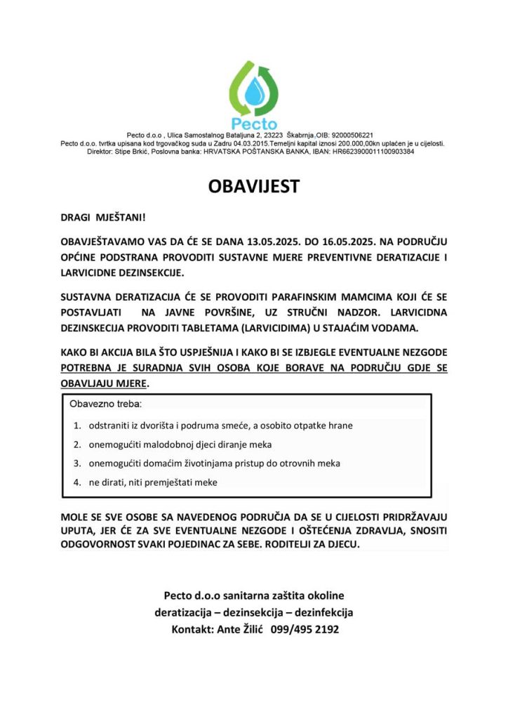 Obavještavamo Vas da de se dana 13.05.2025. započeti sa provođenjem obvezatne preventivne proljetne deratizacije i larvicidne dezinsekcije na području Opdine Podstrana, ista de trajati do 16.05.2025.