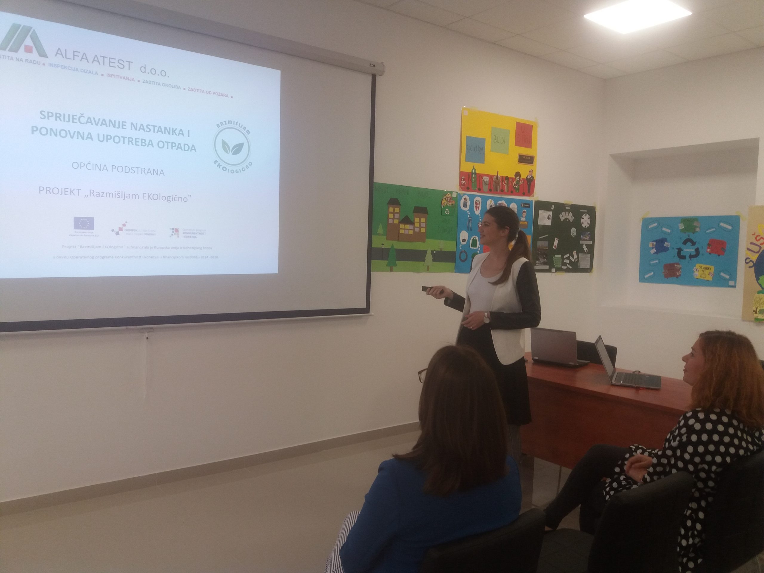 Stručno izlaganje na teme „Sprječavanje nastanka otpada i ponovna upotreba predmeta“ i „Pravilno odlaganje otpada“ pripalo je predstavnicama tvrtke Alfa atest d.o.o., pa je tako Antonija Bulić, mag.chem kroz svoje izlaganje iznijela mnogo korisnih primjera kako spriječiti nastanak otpada i na koje sve načine možemo upotrijebiti predmete koje bi inače odbacili i istaknula kako su upravo postupci sprječavanja nastanka otpada i ponovna upotreba predmeta najpoželjniji postupci u gospodarenju otpadom. Pregled raspoložive infrastrukture na području Općine Podstrana za pravilno odlaganje otpada koji nastaje u kućanstvu s uputama gdje s kojom vrstom otpada izložila je Jana Ivanišević, dipl.ing.kem.tehn. Potom je otvorena javna rasprava u koju se građani aktivno uključili, pa je tako bilo pitanja gdje sa biootpadom iz vrtova te građevnim otpadom koji je nastao od rekonstrukcija u kući.