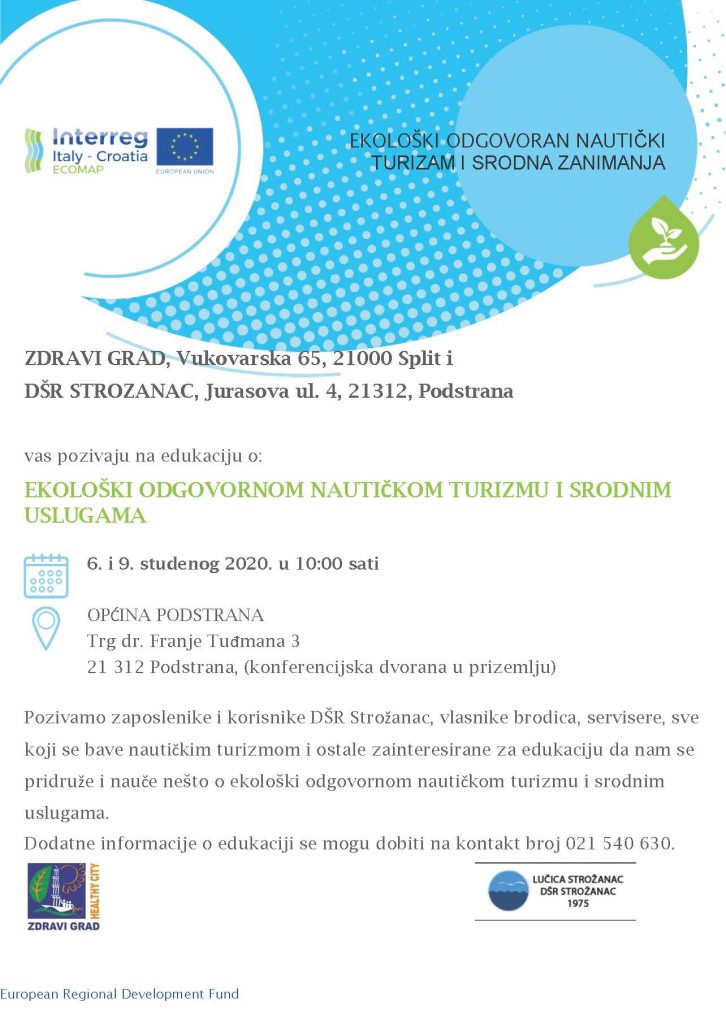 Pozivamo zaposlenike i korisnike DŠR Strožanac, vlasnike brodica, servisere, sve koji se bave nautičkim turizmom i ostale zainteresirane za edukaciju da nam se pridruže i nauče nešto o ekološki odgovornom nautičkom turizmu i srodnim uslugama.