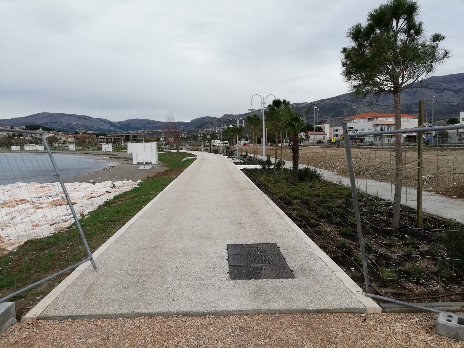- Biciklistička staza dužine 363 m nalazi se na dionici od ušća rijeke Žrnovnice do sportske lučice Strožanac te predstavlja dio kapitalnog projekta Općine Podstrana. Biciklistička staza izvodi se u profilu širine 2 m, čime je omogućen dvosmjerni promet biciklista na stazi. Projektnim rješenjem (zelene površine izvode se obostrano) osiguran je slobodni profil za kretanje biciklista tako da je ukupna širina profila 2.5 m. Projektom uređenja obalnog pojasa obuhvaćena je biciklistička staza, suvremena javna rasvjeta i dužobalna šetnica. Projektnim rješenjem definiran je kontakt dužobalne šetnice i stabilizirajućih pera koji, osim svoje osnovne funkcije, služe i kao nastavci obalne šetnice s pogledom na morske vizure. Otvaranjem vizura, projektiranjem jasnih i kontinuiranih biciklističkih i pješačkih pravaca te uvođenjem javnih sadržaja podiže se razina kvalitete života na ovom području te potiče korištenje prometnih rješenja prihvatljivih za okoliš. Zahvat obalne šetnice, širine 3.50 m, pruža se obalnim pojasom – pomorskim dobrom i to, na dijelu koji se uglavnom formira nasipanjem obalnog pojasa te formiranjem nove obalne crte. Dijelovi šetnice su i odmorišta u funkciji pješačkog i biciklističkog prometa. Izvode se kao dvije niše u paru. U svakoj niši je smještena urbana galanterija (klupa i koš za otpatke, a između niša je predviđeno stablo koje osigurava zasjenjenje odmorišta). Na predmetnoj dionici obale u izgradnji je također i atraktivna obiteljska plaža opremljena brojnim sportsko rekreativnim sadržajima te je prilagođena i osobama sa smanjenom pokretljivošću. Budući u obalnom pojasu ne postoji prometna površina koja bi bila alternativni koridor za odvijanje kolnog i pješačkog prometa te za polaganje komunalnih instalacija, planirana obalna šetnica zadovoljava i specifične zahtjeve: minimalne tehničke uvjete za kretanje interventnih vozila i vozila komunalnih tvrtki za potrebe održavanja. Projekt osigurava kontinuitet veza na početku i kraju šetnice. Šetnica se, na zapadnom dijelu, veže na pješački pločnik uz južni rub državne ceste, a na istočnom kraju veže se na pješačke površine na prostoru lučice Strožanac. Sve specifičnosti šetnice i biciklističke staze su opisane u tehničkom opisu građevinsko-prometnog projekta oznake KNJIGA K3 T.D. 25/16.Osim izgradnje i opremanja biciklističke staze i šetnice u okviru projekta uređenja obale, projektom Morsko riječne šetnice i biciklističke staze „Podstrana walk & bike“ planira se i dodatno opremanje tog dijela staze u vidu postavljanja dvije pametne klupe te jedne dvostrane reklamne vitrine sa ucrtanim biciklističkim rutama na području Podstrane te svim servisnim informacijama za bicikliste i šetače. Predloženo ulaganje iznimno je značajno za Općinu Podstrana jer je dosadašnje stanje čestica koje prijavljujemo bilo u potpunosti neiskorišteno. Obalno područje bilo je muljevito i zapušteno, bez adekvatne infrastrukturne opremljenosti te nije bilo prilagođeno osobama s invaliditetom. Značaj predloženog ulaganja za Općinu Podstrana razvidan je i sa aspekta poboljšanja stanja u prostoru s obzirom da će se neiskorišteni prostor povezati u krajobrazno osmišljenu cjelinu što će doprinijeti poboljšanoj funkcionalnosti prostora te boljoj vizualnoj percepciji i prepoznatljivosti područja općine. Odabir hortikulturnih sorti, tradicionalno prisutnih u mediteranskim područjima, osigurava jednostavnost održavanja, otpornost na blizinu morske obale i vremenske uvjete. Realizacijom projekta predviđeno je ozelenjavanje površine od ukupno 6.250 m2 što doprinosi kvaliteti javne turističke infrastrukture te utječe na poboljšanje životnog standarda lokalnog stanovništva.